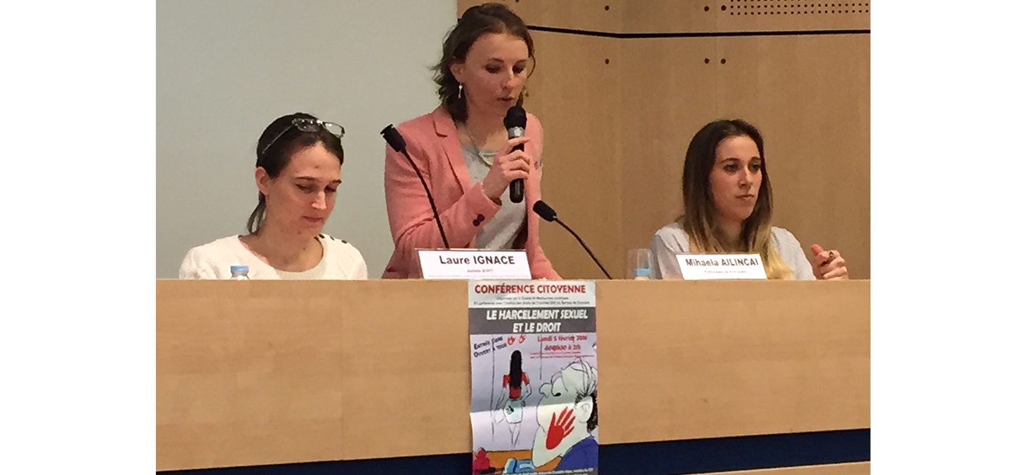 Lundi 5 février 2018 : Intervention de Albane Miran, étudiante du Master 2, à la Conférence citoyenne à l’Office du Tourisme de Grenoble sur le thème du harcèlement sexuel, avec le Professeur Marc Pichard (Professeur de droit privé à l’Université de Paris-Ouest Nanterre et coordinateur du projet REGINE) et Madame Laure Ignace (juriste à l’Association européenne contre les violences faites aux femmes au travail - AVFT).